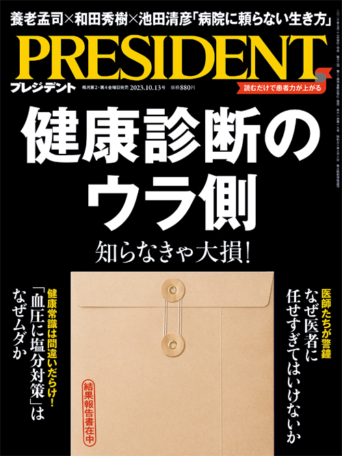 2023年9月22日発売の「プレジデント」(2023年10月13日号)は、「健康診断のウラ側」と題した特集を組んでいる。健康診断、人間ドック、定期健診がムダかもしれないという。その訳とは......。
