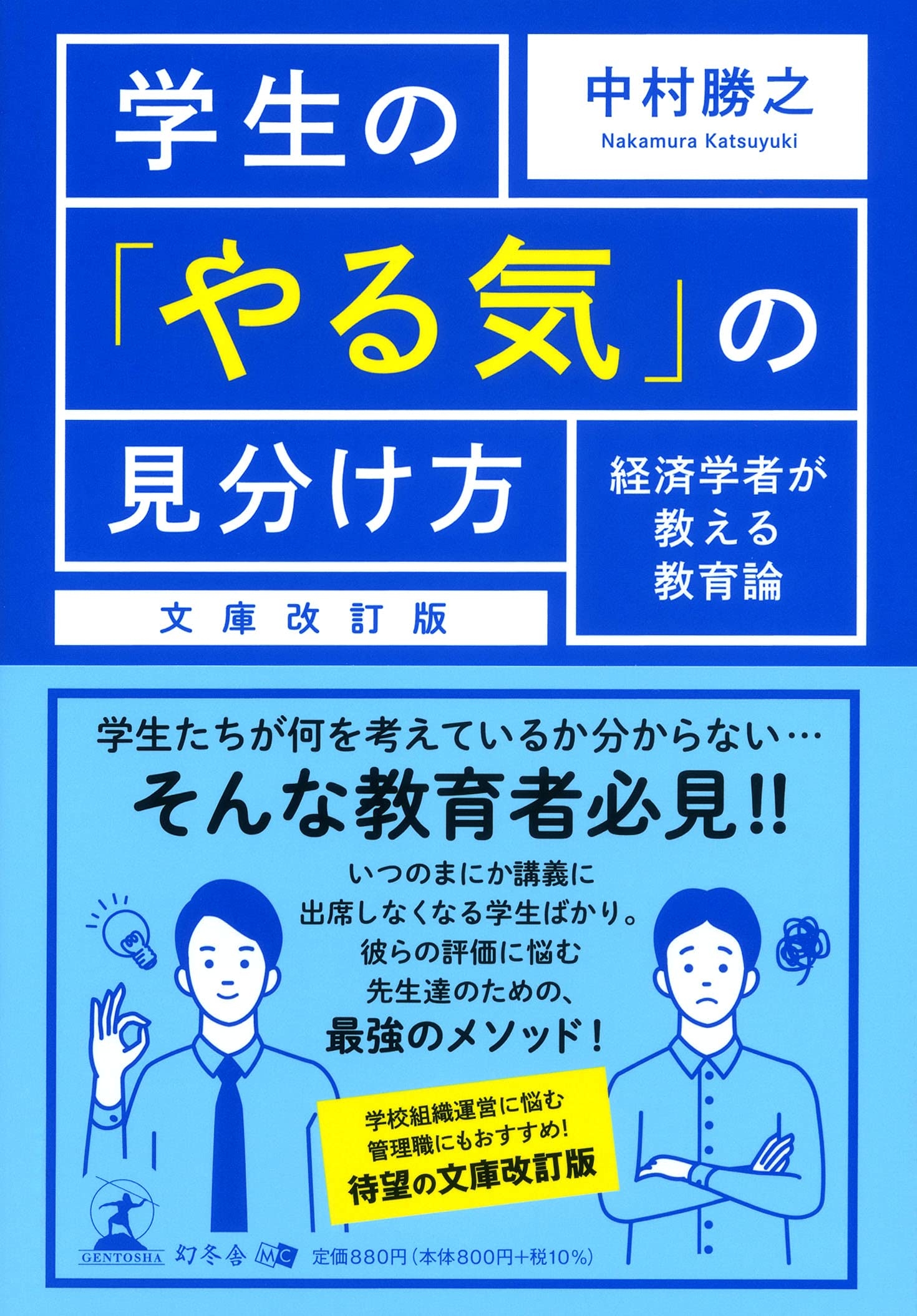 桃山学院大学経済学部教授の中村勝之氏が執筆した『文庫改訂版 学生の「やる気」の見分け方 経済学者が教える教育論』(幻冬舎刊)は、中村氏の実践例や蓄積したデータをもとにしながら、学生の「やる気」を見分ける考え方がつづられている。