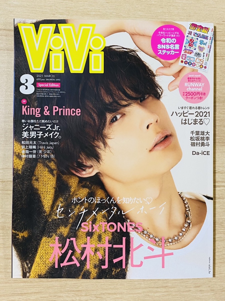 「ViVi(ヴィヴィ) 2021年3 月号特別版」の表紙を飾るのは、SixTONESの松村北斗さん。中面では6ページにわたる特集が組まれている。