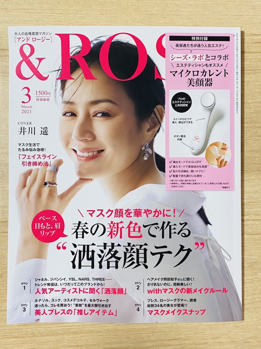 「&ROSY(アンドロージー) 2021年3月号」(宝島社)の付録は、美容通が通う人気エステ、シーズ・ラボとコラボした「マイクロカレント美顔器」だ。