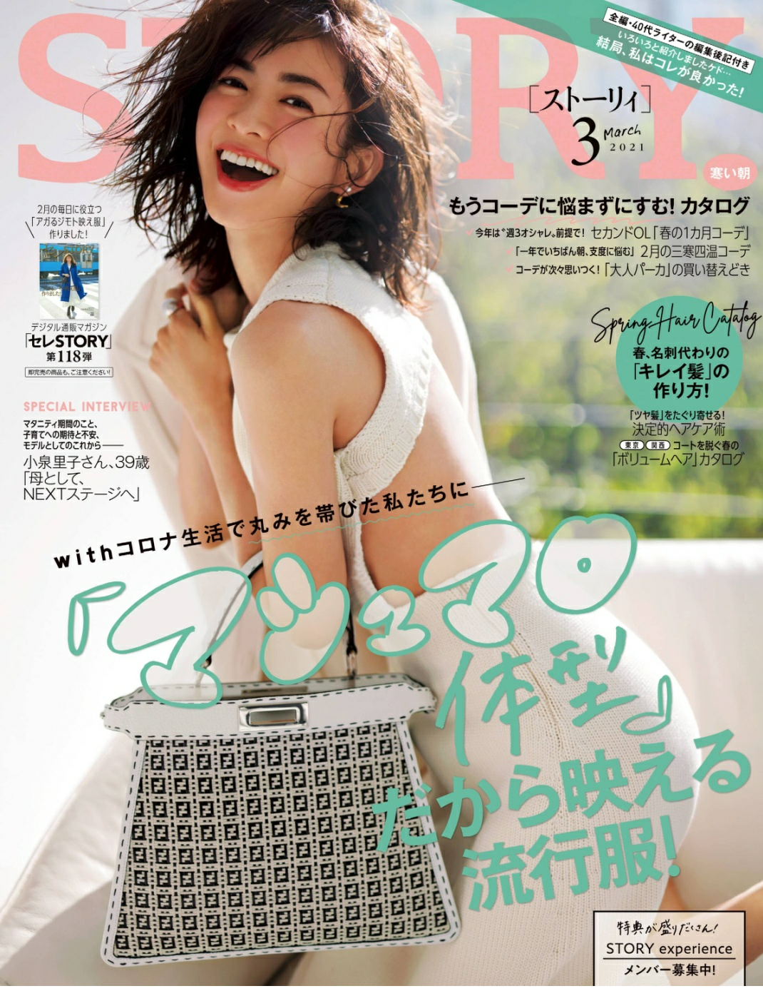 「STORY」3月号(光文社)には小泉さんの企画のほか、「『マシュマロ体型』だから映える流行服」、「寒い朝、もうコーデに迷わずにすむ!カタログ」、「春、名刺代わりのキレイ髪の作り方!」などが掲載されている。