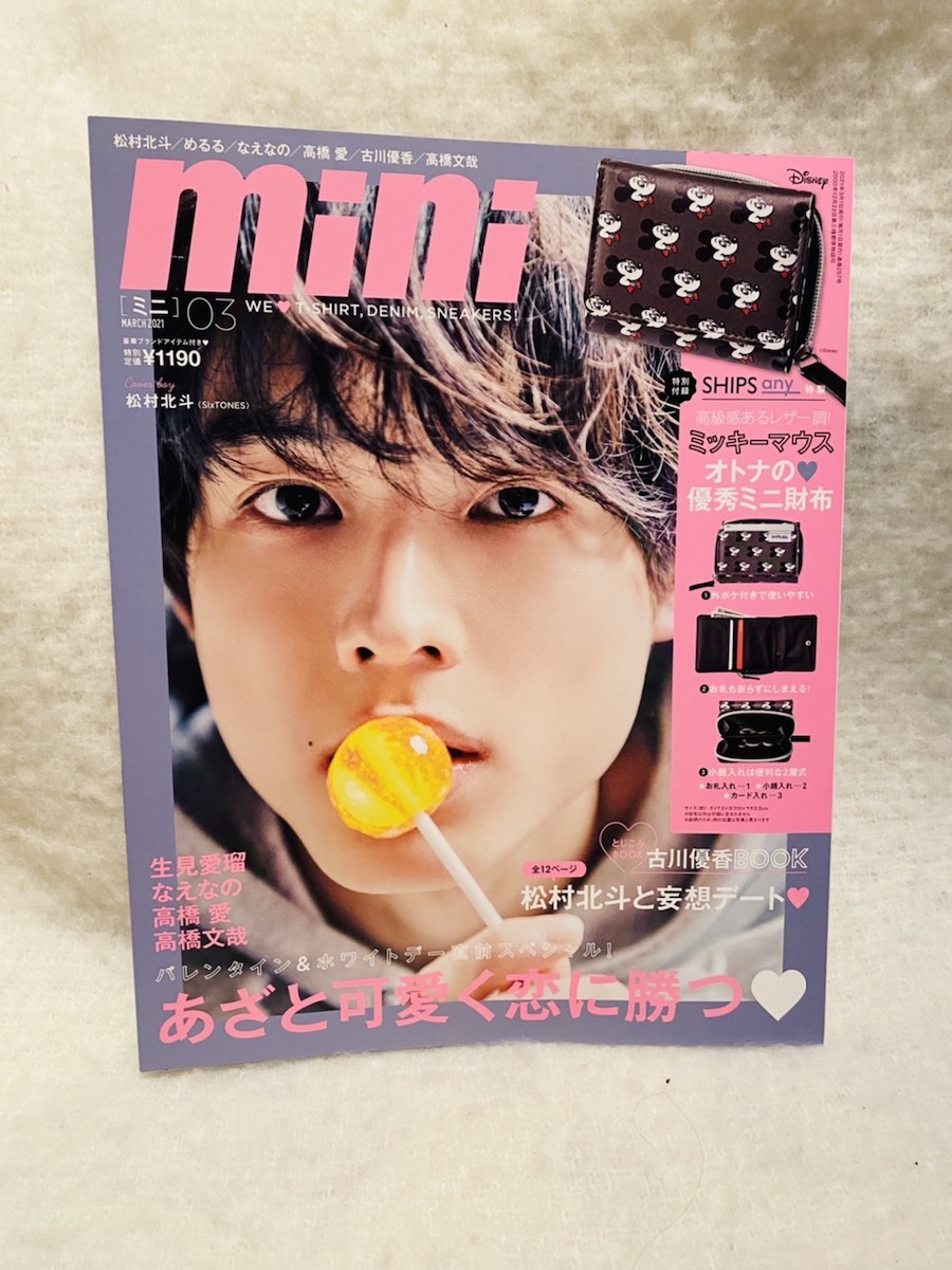 2月19日に主演映画「ライアー×ライアー」の公開を控え、俳優としても、アーティストとしても大活躍の松村北斗さん。「mini 2021年3月号」(宝島社)の表紙には、キャンディーを持ったぷっくりほっぺの松村さんが登場している。なんと「mini」では、初のカバーボーイとなる。