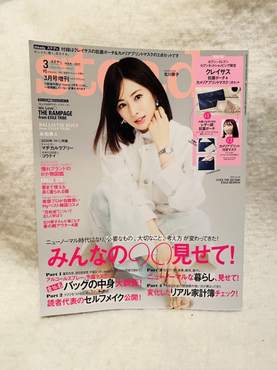 タートルネックのシャツと、ホワイトデニム姿がかっこいい北川景子さんが表紙の「steady. 2021年3月号増刊」(宝島社)は、セブン-イレブンとセブンネットショッピングの限定販売だ。