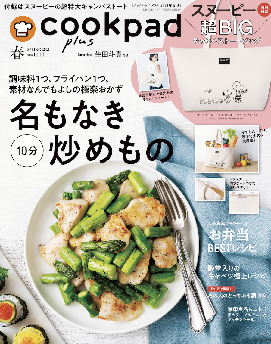 2月25日に発売された「cookpad plus2021年春号」(扶桑社)には、世代を超えて愛されるスヌーピーのトートが付録としてついてくる。