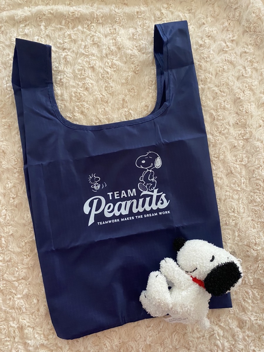 日常の必需品となったエコバッグ。TEAM Peanutsの文字とスヌーピー、ウッドストックがプリントされたシンプルなデザインで、カジュアルな服装にも、シックな服装とも相性が良いネイビーを使用している。