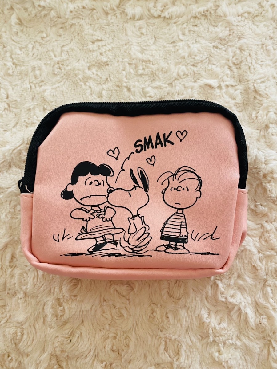 気分が上がる明るいピンクに、スヌーピーの仲間たちが大きくプリントされている。両面プリントで、表と裏で一続きのマンガになっている。
