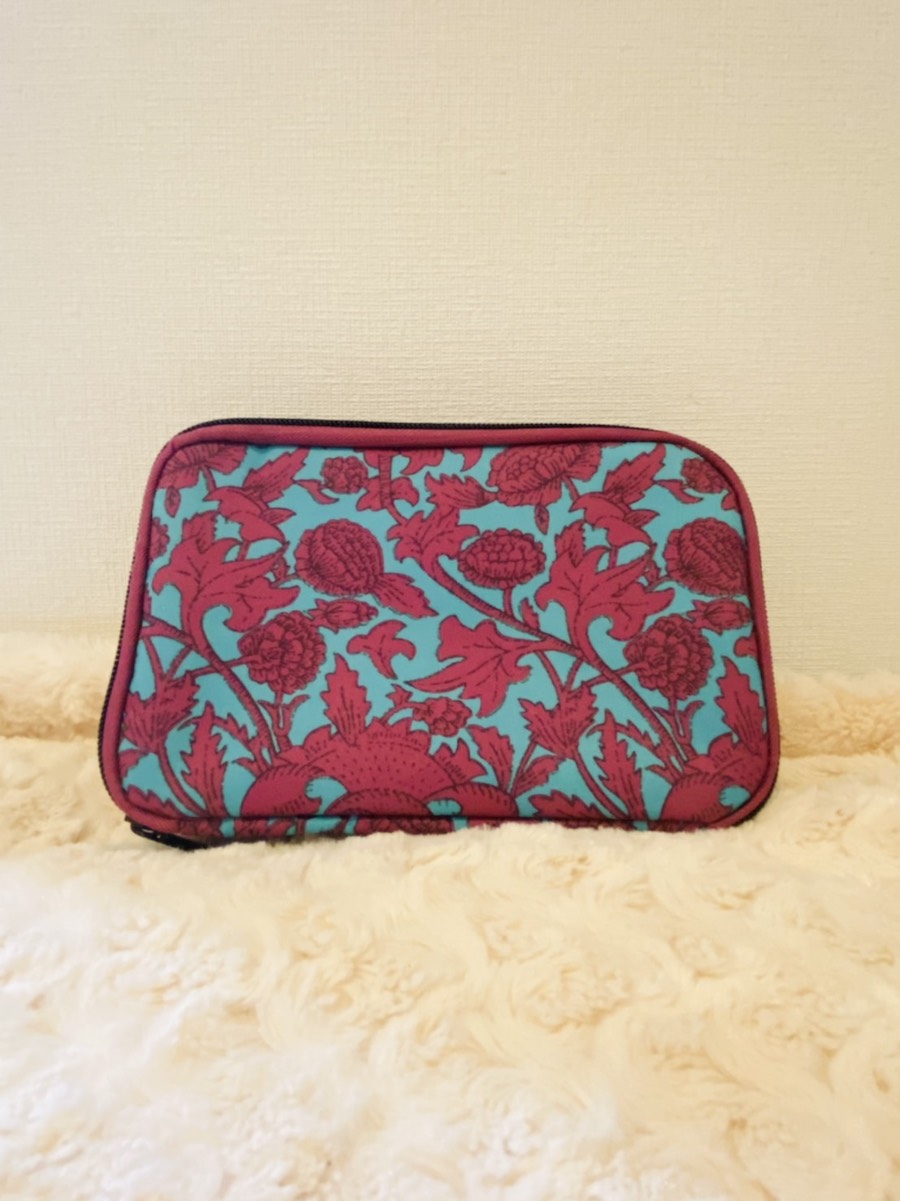 水色をベースにボタニカルな花柄が印象的な本アイテムの特徴は、ダブルファスナーが付いていること。ミニポケットもあるので、普段使いのコスメポーチや、衛生グッズケースとして持ち歩くのに便利だ。