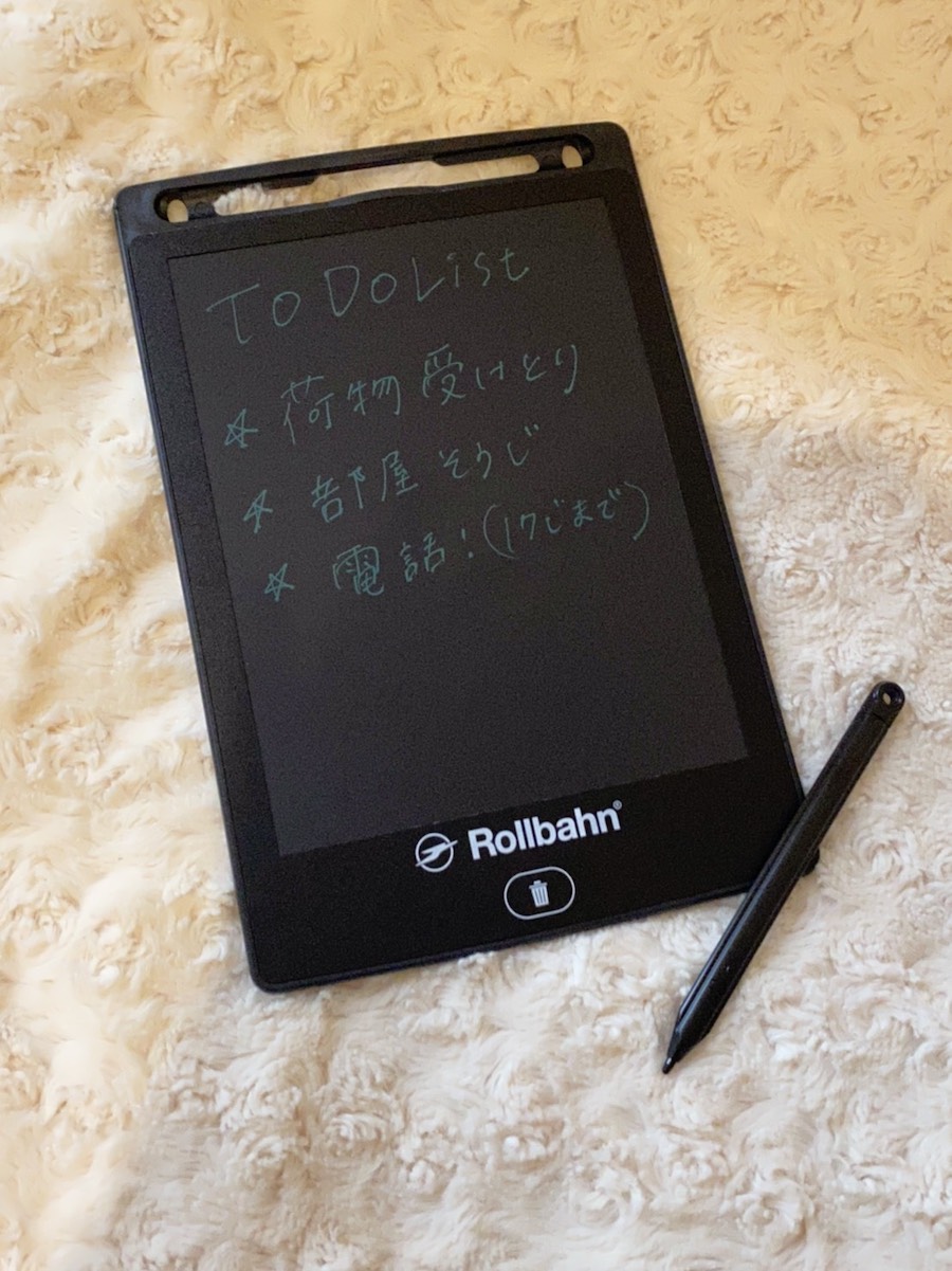 繰り返し文字を書いて、消すことができる便利でエコなデジタルメモパッドだ。急にかかってきた電話や、今日のTODOリストに使ってみよう。