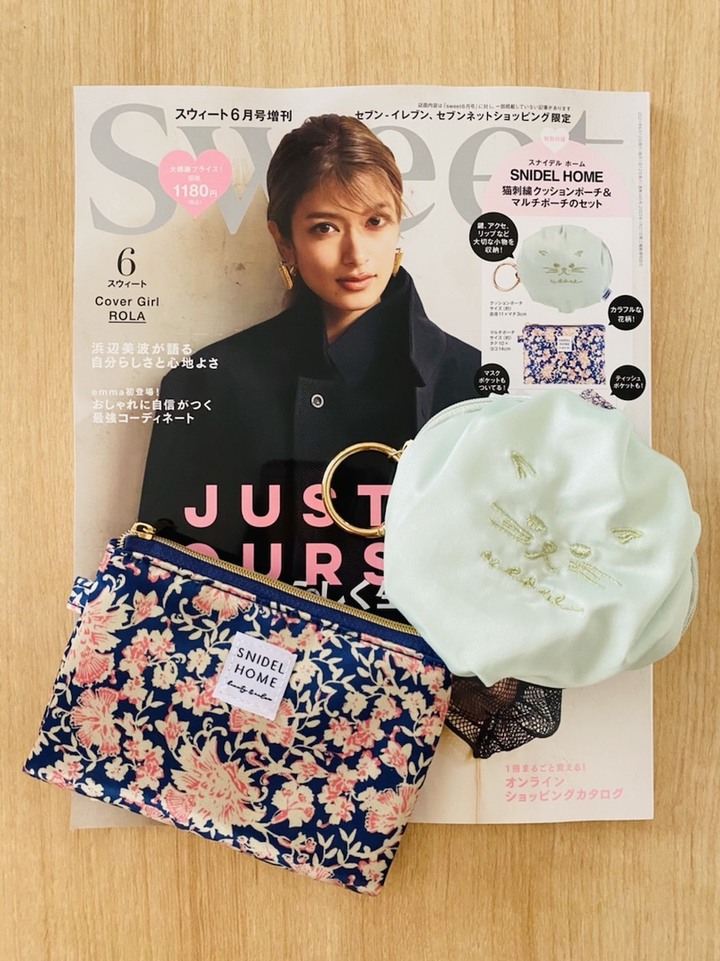 「sweet 2021年6月号増刊」(宝島社)から、可愛すぎて付録とは思えない「SNIDEL HOMEの猫刺繍クッションポーチ&マルチポーチのセット」が特別付録に登場した。