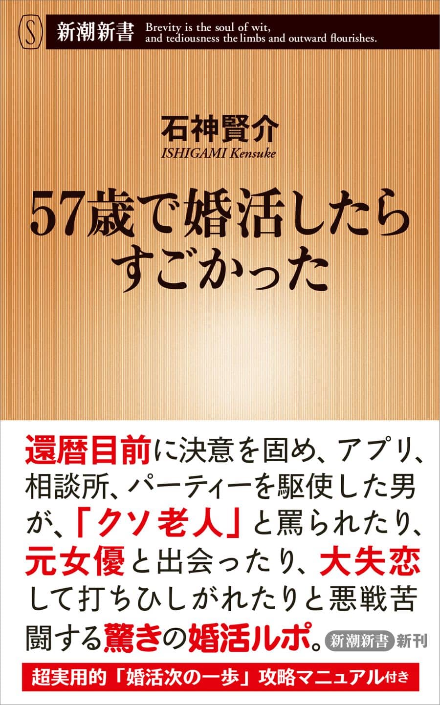 ライターの石神賢介さんによる婚活奮闘記『57歳で婚活したらすごかった』(新潮社)は、還暦を目前にして「一人がつくづく嫌になった」という石神さんが、57歳で婚活をした経験を赤裸々に綴った婚活ルポだ。