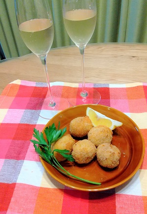 まずは「オリーブだんごのフライ」から。塩漬けのグリーンオリーブを肉だねで包み、衣をつけて揚げるという斬新な料理だ。少なくとも記者はいままで食べたことがない。