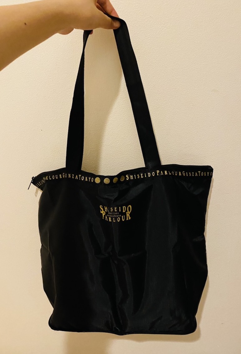 そこでオススメしたいのは、ブラックの生地にゴールドの文字がおしゃれな「資生堂パーラー上品パッカブルバッグ」だ。