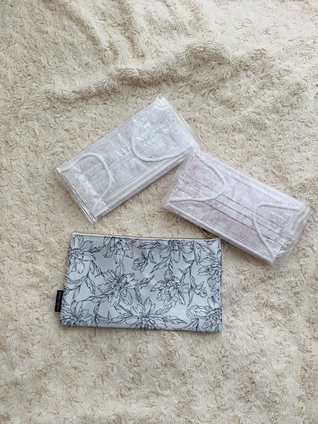 本アイテムは、シンプルで上品なデザインがお洒落なSNIDEL HOMEの花柄不織布マスクである。カラーは、ピンクとパープルの2色展開で、各7枚、計14枚入り。加えて、ケースにもなる抗菌ポーチもセットで付いている。
