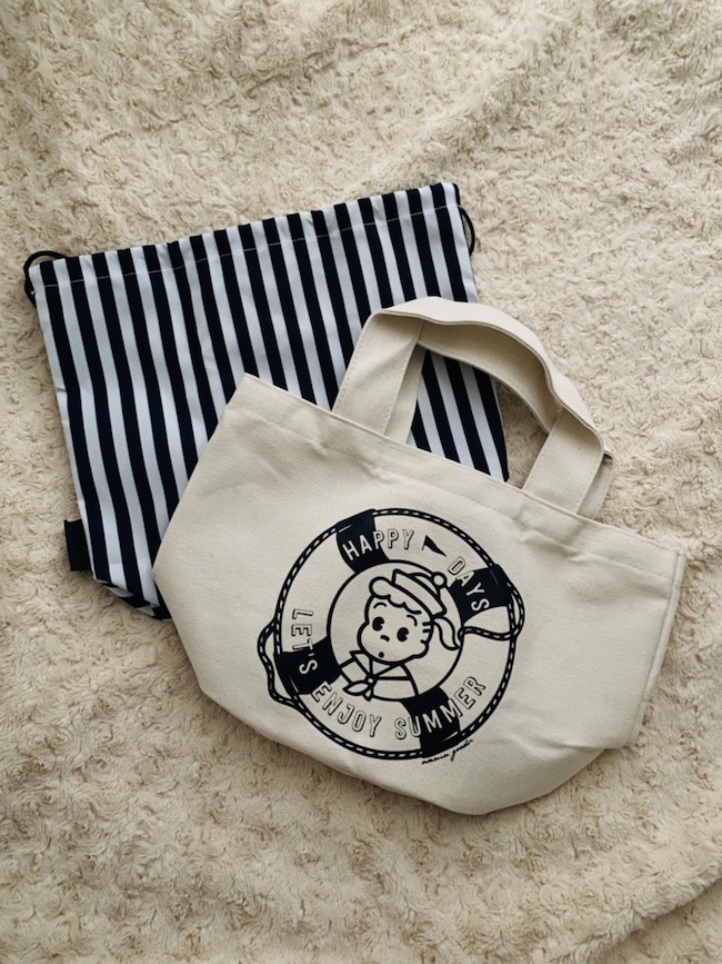 今回付録となったのは、ネイビーとホワイトのストライプ柄がオシャレな巾着バッグと、マリンテイストな「ジル」が大きくプリントされた厚手キャンバス地のお出かけバッグの2点セットである。