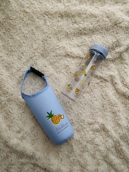 クリアボトルのサイズは高さ19.5×直径6.5cmで、容量は約500ml。寝転ぶリラックマとパイナップルがプリントされており、涼しげで癒される。