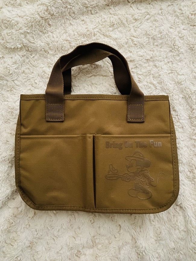 布地と同系色のミッキー柄が大人っぽくて、男女で兼用できる。家の中でも外でも、どこへでも連れていきたくなるバッグだ。