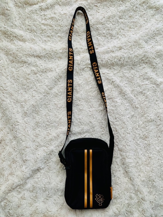 内側にはオレンジ色の生地を使用。物を取り出す際にチラリと覗くのがおしゃれだ。ショルダーストラップには、GIANTSロゴをふんだんに織り込む徹底ぶり。