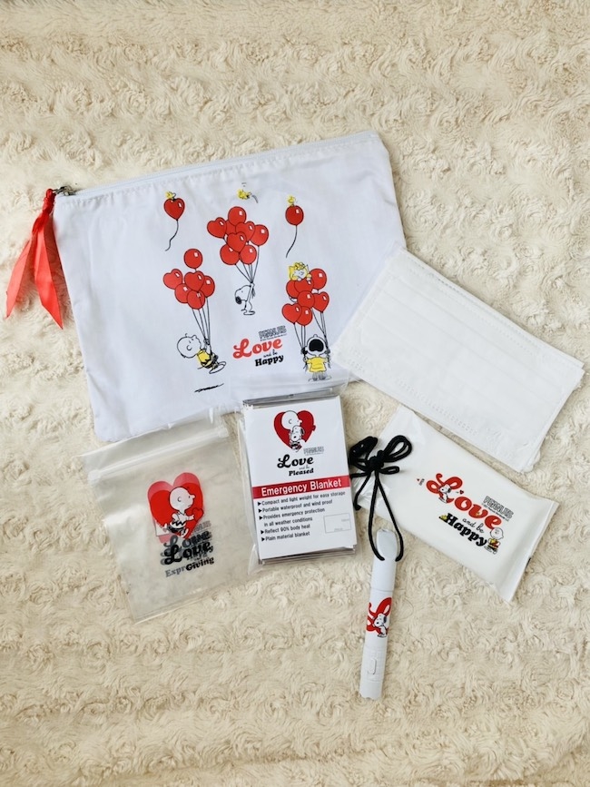 防災セットというと無機質なデザインのものが多いように思う。そんな中でも、本アイテムには、ハートや風船と共に描かれたスヌーピーたちがなんとも愛らしい。