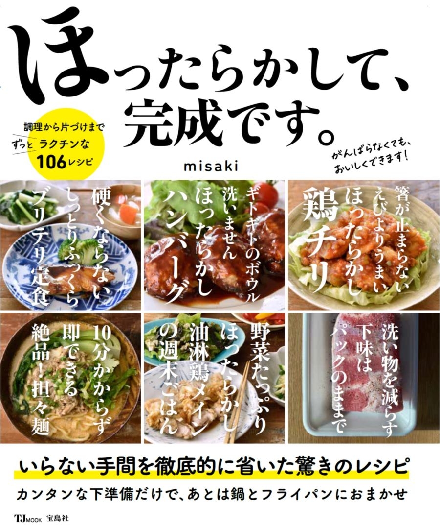 2021年8月31日発売の『ほったらかして、完成です。』(宝島社)は、石川県能登在住の主婦misakiさんのInstagramから生まれた。日々忙しい主婦向けに最小限の調理工程のレシピを発信しているmisakiさんのノウハウが詰まっている。