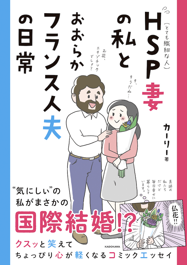 Instagramで話題沸騰中の『HSP妻の私とおおらかフランス人夫の日常』(KADOKAWA)が書籍になって8月26日に発売された。本書は、名古屋在住でHSP(とても繊細な人)気質のカーリーさんと、その夫であるおおらかなフランス人ジャンさん、真逆の2人が織りなすゆるくて平和な日常を描いたコミックエッセイだ。