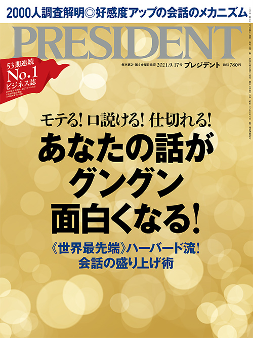 8月27日発売の「プレジデント」(2021年9月17日号)は、「あなたの話がグングン面白くなる!」という特集を組んでいる。