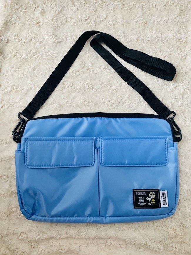 こちらは、「mini10月号」(宝島社)の特別付録で、デニムやメンズライクな服装と相性が良いパステルブルーカラーのショルダーバッグである。スヌーピーがサングラスをかけてクールにキメた「ジョー・クール」とチャーリーブラウンのワンポイントロゴがお洒落でかわいい。