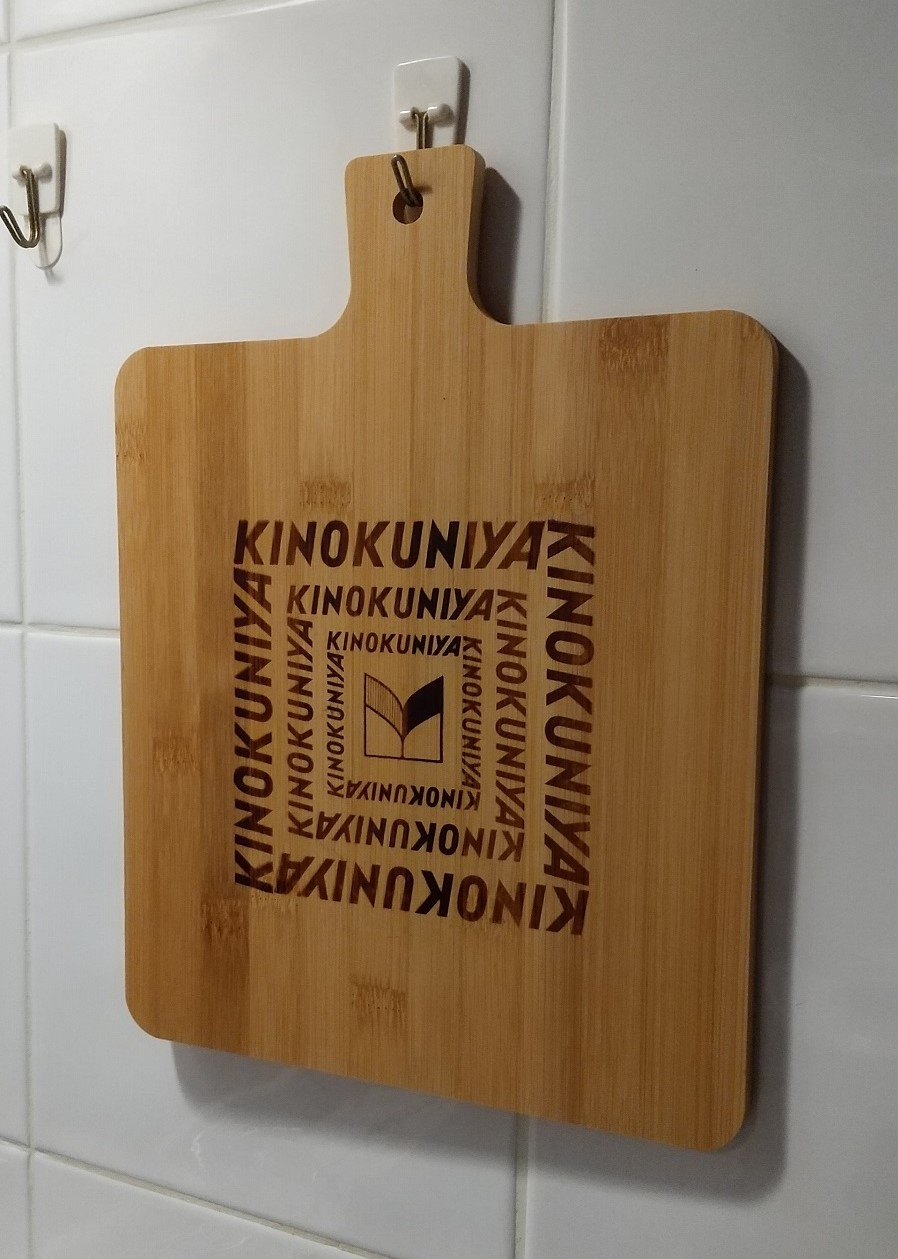 竹を組んで作った自然素材のカッティングボードは、横23×縦21cm。中央にはKINOKUNIYAのロゴが、焼き印風に大きくデザインされている。