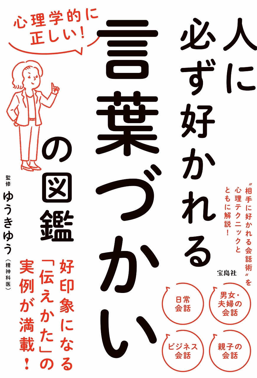 精神科医のゆうきゆうさんが監修した『心理学的に正しい! 人に必ず好かれる言葉づかいの図鑑』(宝島社)は、"相手に好かれる会話術"を心理テクニックとともに解説している。日常会話からビジネス、男女・夫婦の会話、親子の会話まで、好印象になる伝え方の実例が満載だ。