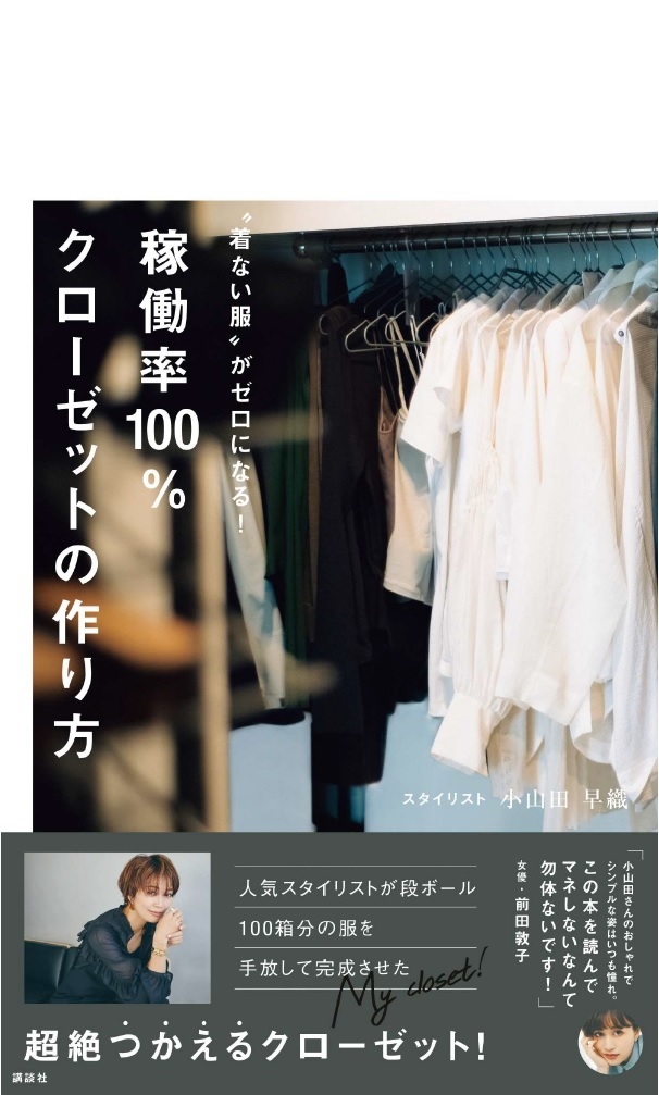 テレビ番組『ヒルナンデス!』(日本テレビ)やおしゃれ着洗剤のCMなどでおなじみのスタイリスト・小山田早織さん。スタイリストだからプライベートの服も着ないものがあるくらい大量に持っているのでは......と思いきや、意外にも着ない服が一着もない「稼働率100%のクローゼット」を作っているという。そんな小山田さんが、クローゼットの整理のポイントや着回しのコツ、スタイリストならではの審美眼で厳選した収納アイテム、インテリアなどを一冊にまとめたのがこちらの本。