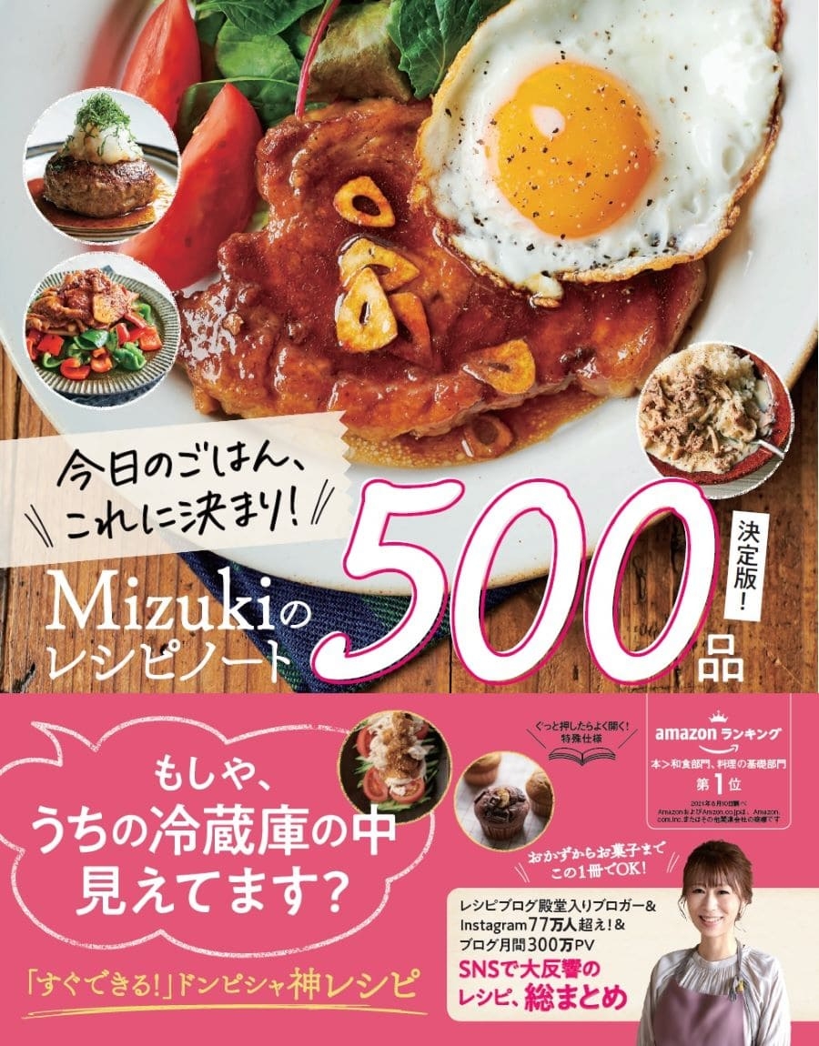 2021年9月に発売されたばかりのレシピ集『今日のごはん、これに決まり!Mizukiのレシピノート決定版!500品』(学研プラス)は、早くも10万部を突破する大反響を生んでいる。冷蔵庫の中にあるもので作れる献立を提案してくれる辞書のようなレシピ集だ。