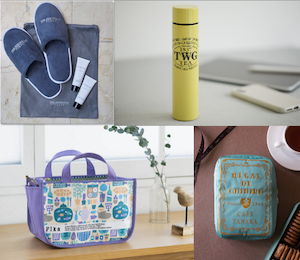 下記画像にあるように、5つ星ラグジュアリーホテル「ザ・ペニンシュラ東京」スイートルームのルームスリッパ&アメニティや、シンガポール創業のラグジュアリーティーブランド「TWG Tea」のステンレスボトル、名古屋の老舗喫茶店「カフェタナカ」の入手困難なクッキー缶を模したポーチ、北欧デザインが人気の北欧菓子「Fika」のインテリアトートなど、日常に上質さをプラスしてくれるアイテムが並ぶ。