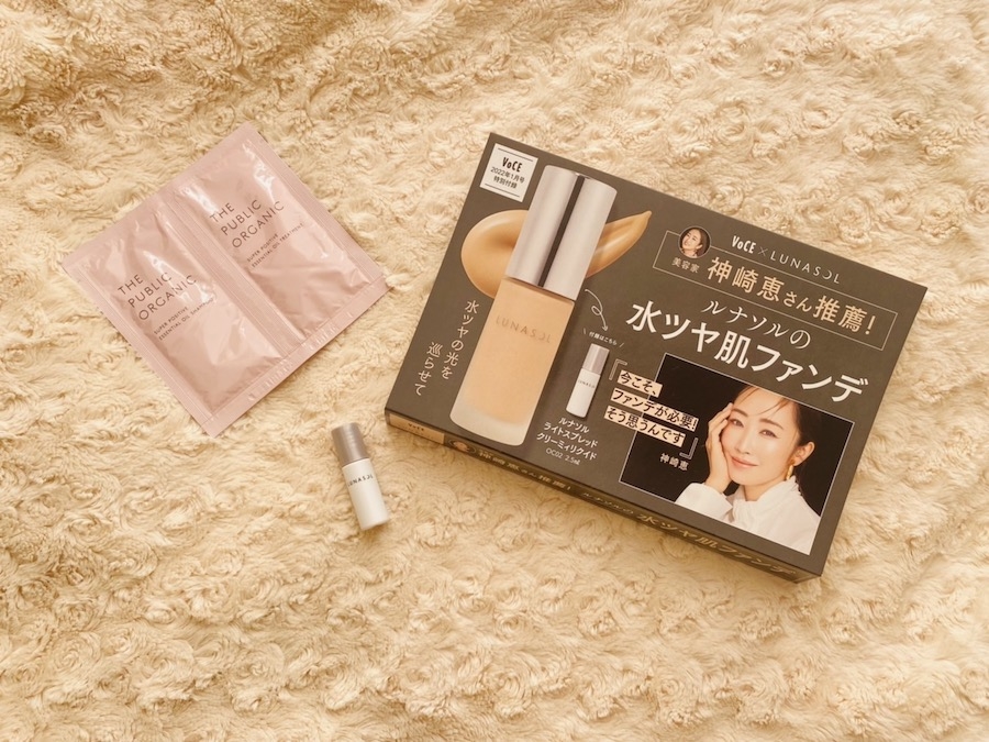 美容家の神崎恵さんが絶賛する「ルナソルの水ツヤ肌ファンデ」こと「ライトスプレッドクリーミィリクイド OC02」のミニボトル(2.5ミリリットル)が「VOCE 1月号」(講談社)の付録に登場した。