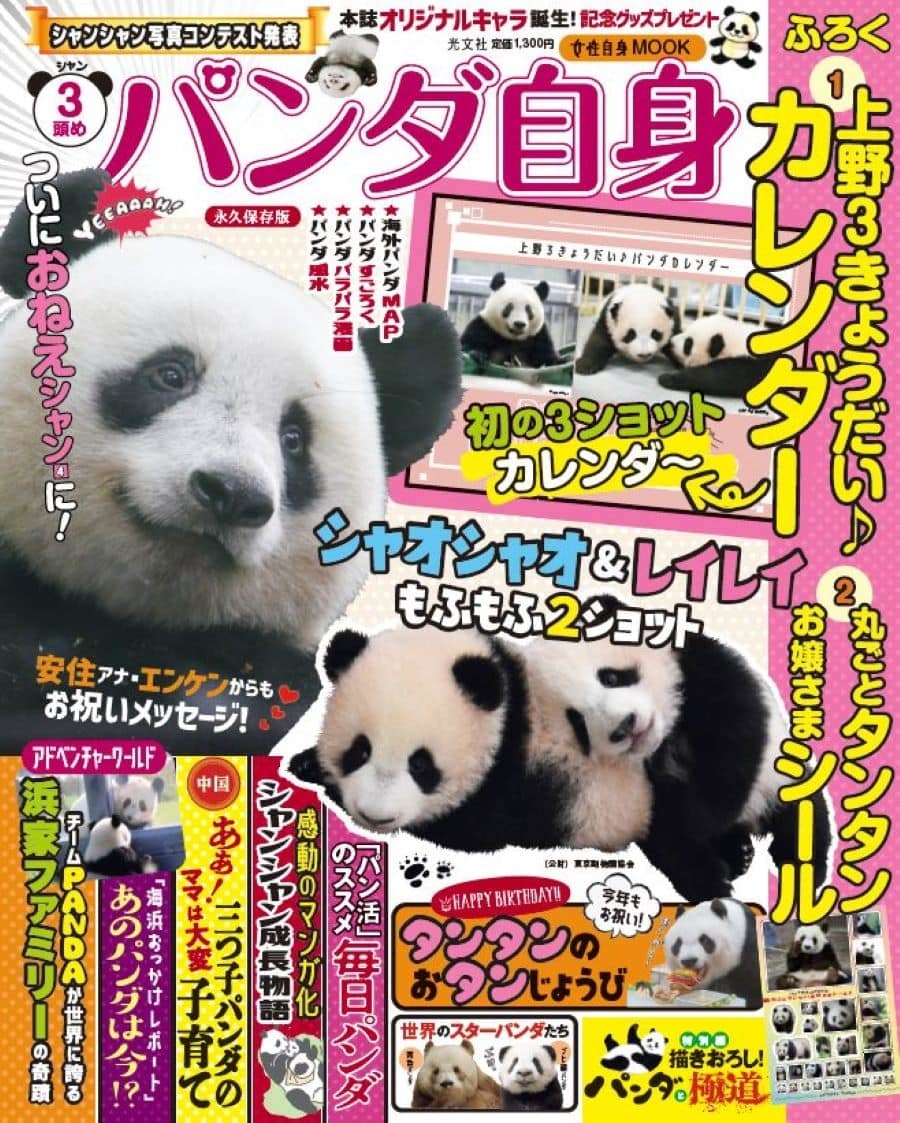 上野のふたご誕生やシャンシャン中国返還期限延期などでますます注目を集めているパンダ界。「3頭め」では、上野3きょうだいのカレンダーや、タンタンのシールがついてくる。また、シャオシャオとレイレイの2ショットやタンタンのお誕生日特集なども掲載。