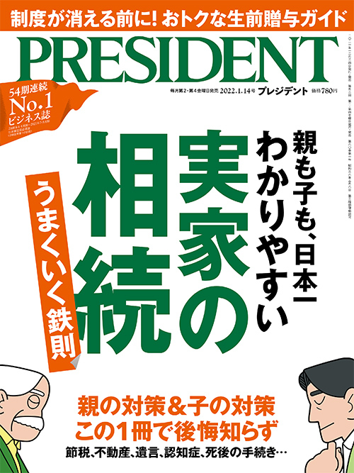 12月24日発売の「プレジデント」(2022年1月14日号)の特集は、「親も子も、日本一わかりやすい 実家の相続」。年末年始で親子が会う機会に、じっくり話し合い、備えをしてみたらどうだろう。