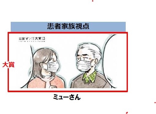大賞は、「がん対策 大腸がん検診」を患者家族視点で描いたミューさんの作品。患者の感染不安や葛藤によるコロナ禍の受診控えについて、温かいタッチで描いている。