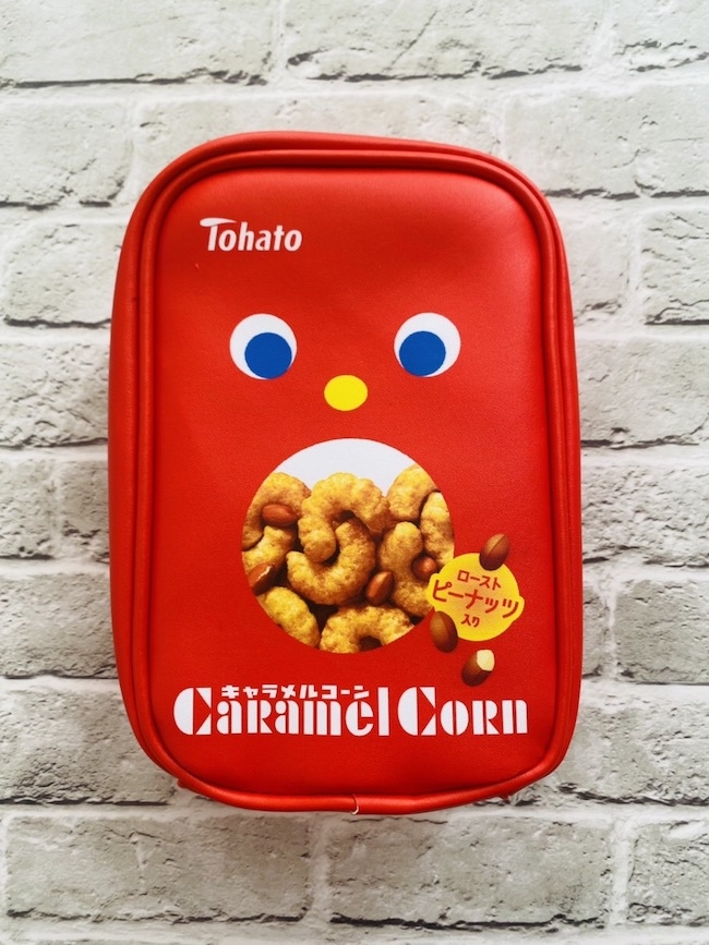 本アイテムは、キャラメルコーンの生誕50周年を祝ってコラボしたもの。真っ赤なパッケージがそのままポーチに、青い目もキャラメルコーンが見えるお口もそっくり。見ているだけで、甘くてさくさく、口の中に広がるキャメル味が思い出され、コンビニに走りたくなる!