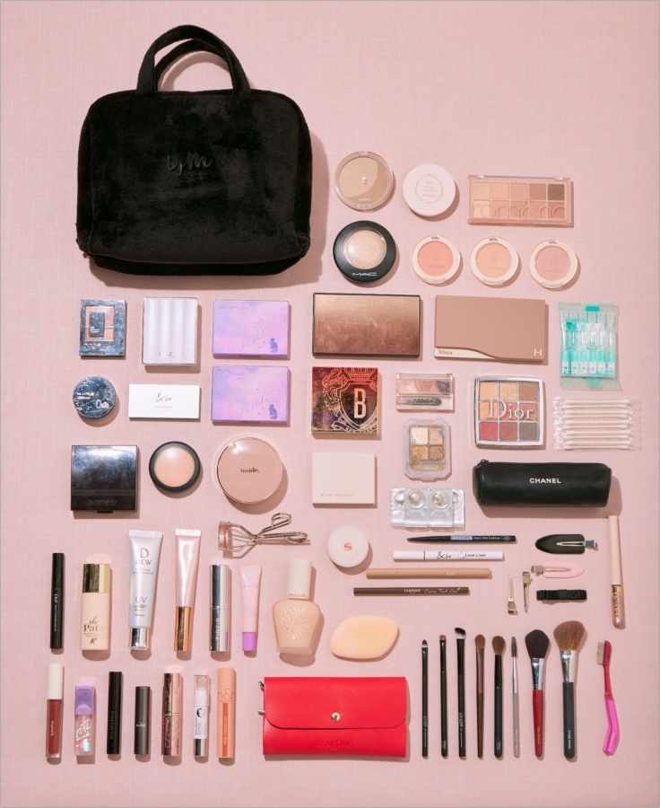 サイズは(約)縦17×横24×マチ9㎝と大容量なので、メイクポーチ以外にも、いろいろな活用法がありあそうだ。メッシュポケットやゴム付きのポケットなど、小物整理に最適なミニポケットの他にも、アイライナーからブラシ、10色パレットなどの長めアイテムを縦にしまえるサイズ感なので、ポーチひとつでたっぷり収納できる優れものだ。