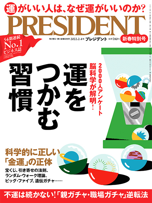 1月14日発売の「プレジデント」(2022年2月4日号)の特集は、「運をつかむ習慣」。運がいい人は、なぜ運がいいのか? さまざまな角度から人間の「運」について、迫っている。