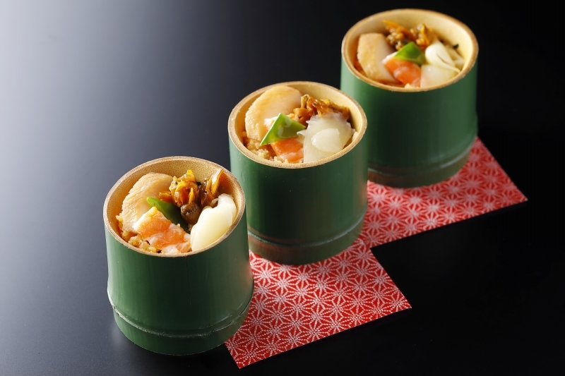 禰豆子をイメージさせる竹筒には、ふっくらと炊き合げた酢飯と海老、旬の具材を盛り付け、特製ばら散らしに。