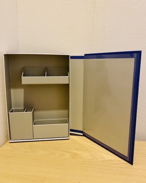 小物の整理、収納に便利な本アイテムは、自立型のオーガナイザーである。サイズは高さ25.7×奥行(背幅)5×幅18.5cmと、ホンモノにそっくりすぎて、文房具ファンにとってはたまらない。
