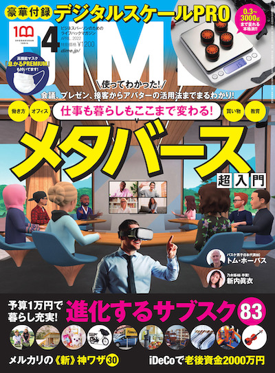 2月16日に発売された「DIME 4月号」(小学館)の第1特集は、近頃なにかと耳にすることの多い 「メタバース超入門」である。アバター作成方法やミーティング設定方法、無料サービスから必要な機材まで、本特集にて徹底解説している。ノウハウと業界動向を知って、仕事も暮らしやすさも爆上げしていこう。