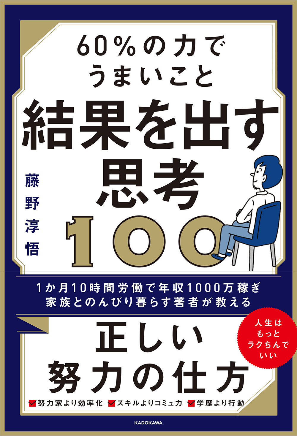 「努力家より効率化」、「スキルよりコミュ力」、「学歴より行動」。こんなに頑張っているのに! と嘆く前に、頑張りを確実に回収し、最小限の力でうまいこと結果を出す。そのための本が藤野さんの著書『60%の力でうまいこと結果を出す思考100』(KADOKAWA)だ。2022年3月17日に発売される。
