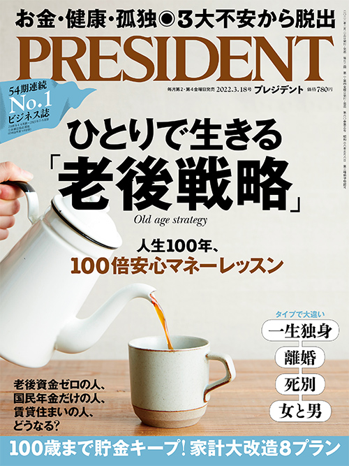 2月25日発売の「プレジデント」(2022年3月18日号)は、人生100年時代に役立つ「ひとりで生きる『老後戦略』」を特集している。一生独身の人、離婚した人、死別した人、貯蓄ゼロの人でも大丈夫だ。こころ強いマネーレッスンは参考になるだろう。
