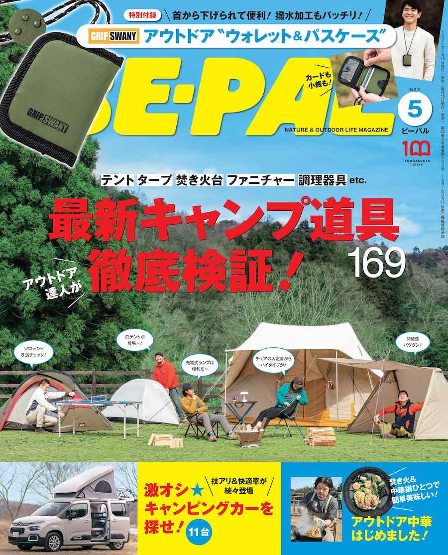 特別付録の「GRIP SWANY×BE-PAL アウトドア"ウォレット&パスケース"」を持って、キャンプに出かけよう。