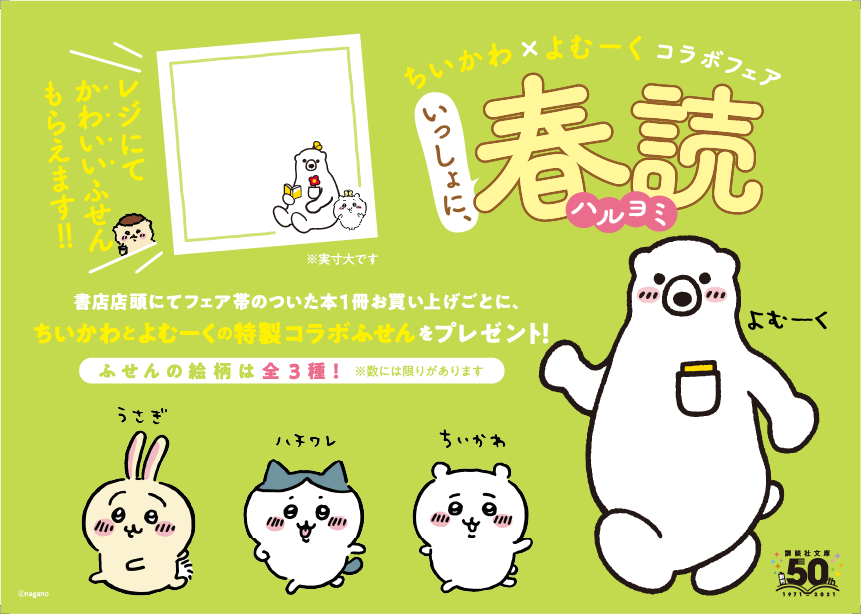 毎年恒例の、講談社文庫春フェア。今年は講談社文庫のキャラクター「よむーく」と、SNSなどで大人気のキャラクター「ちいかわ」がコラボする。文庫本の帯や書店のポスターに、よむーくとちいかわが仲良く登場。白くてモチモチフワフワな、楽しい春になりそうだ。