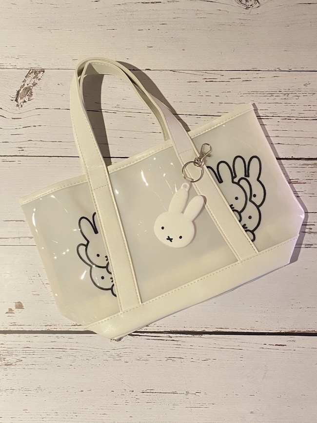 真っ白でミルキーなPVC(ポリ塩化ビニル)素材に、ひょっこりとミッフィーが顔をのぞかせる、シンプルでキュートなデザイン。ワンちゃんのお散歩にも、ちょっとしたお買い物にももってこいなアイテムだ。ランチバッグにしてもいいかも。