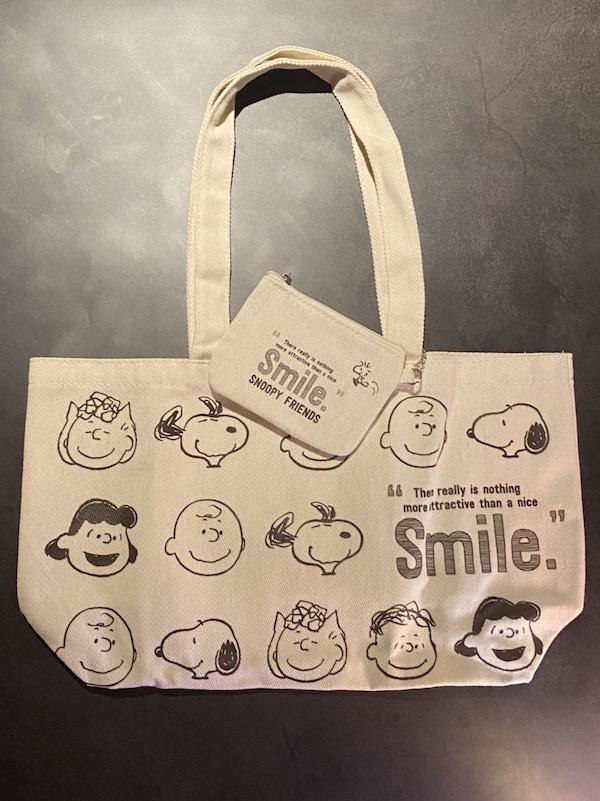 トートにもミニポーチにも、チャーリー・ブラウンの名言である「There is nothing more attractive than a nice smile.(素敵な笑顔ほど魅力的なものはないね)」がプリントされている。人生に優しく寄り添うメッセージに、今日踏み出す一歩にも背中を押してもらえそう。