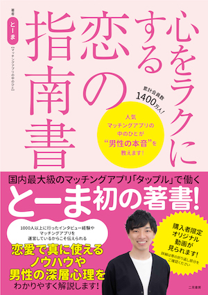 5月25日に発売された『心をラクにする恋の指南書』(二見書房)は、国内最大級のマッチングアプリ「タップル」を運営する会社で働きながら、マッチングアプリ専門家としてYouTubeでも活躍されるとーまさんの初の書籍だ。過去に1000人以上の男女にインタビューをした経験と、実際にマッチングアプリの運営会社で働いているからこそ分かる知見をもとに、楽しく読みやすい1冊となった。