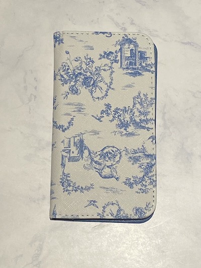 使うたびにときめくようなキュートなデザインが特徴的なスマホケースは、本誌で特集している「フェミ服」との相性も抜群。ホワイトを基調にくすみブルーで描かれた繊細なタッチの絵柄が、大人女子のファッションに上品さをプラスしてくれる。