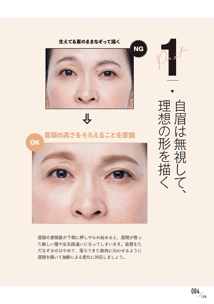 特に40代後半から気をつけてメイクしたいのが、眉頭の表情筋。この部分が下側に押しやられ始める人が非常に多いのだとか。落ちてきた筋肉を無視して若いころと同じように眉頭から描き始めると、眉頭の下の表情筋が余計に目立ち、険しい老け顔に......。ここでは、ポイントを3つ紹介しよう。